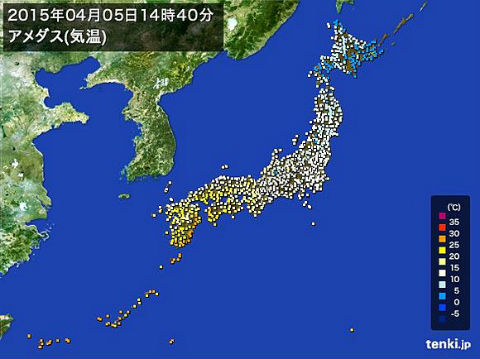本日4月5日、沖縄本島地方伊是名村で13時28分に最高気温が30度まで上がり、宮崎県日向市でも13時35分に30度1分まで上がりました。全国で今年初の真夏日となりました。