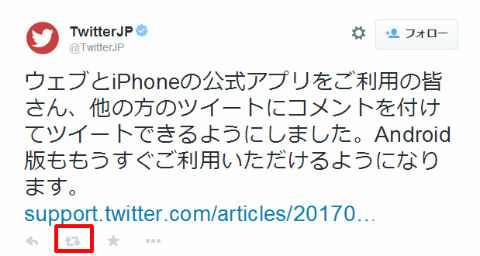 Twitterは、ほかの人のツイートにコメントを付けてツイートできる機能を導入しました。Web版と公式iPhone版アプリで利用でき、Android版アプリももうすぐ対応の予定。