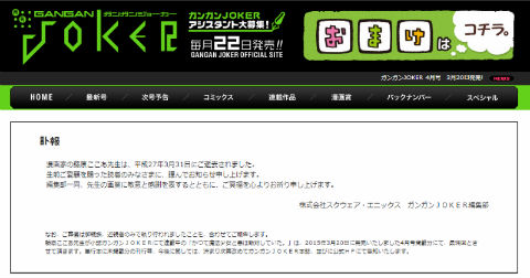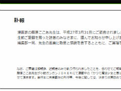 「編集部一同、先生の画業に敬意と感謝を表するとともに、ご冥福を心よりお祈り申し上げます」(ガンガンJOKER編集部)