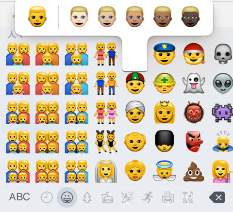 新しい絵文字キーボードでは、人物の顔などの絵文字で肌の色を選べるようになりました。最初に表示される絵文字は黄色になっており、タップすると肌の色が選択可能に(追記:最初に出てくる黄色は、特定の人種を表さないニュートラルな色として使っているとAppleは説明しています)。この変更は、「白人の絵文字が多く、ほかの人種が少ない」としてAppleに絵文字の人種多様性を求めていた声を反映したものです。