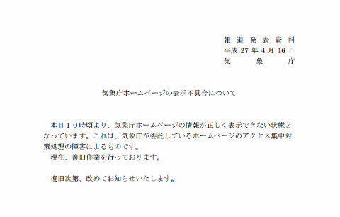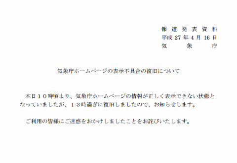 気象庁のWebサイトで4月16日午前10時ごろから、情報が正しく表示できない状態が起きた。午後1時すぎに復旧した。