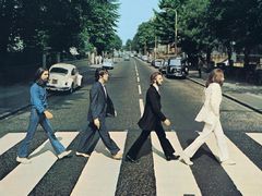 ビートルズ「Abbey Road」(左)と、アビー・ロードでジャケットの真似をする観光客たち(右、Google Mapより)