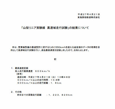 JR東海は4月21日、「山梨リニア実験線 高速域走行試験」の結果を発表した。過去最高となる有人走行最高速度・時速603キロを記録したとしている。