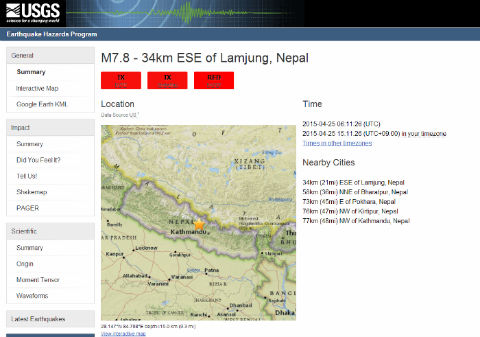 ネパールで現地時間の4月25日に、マグニチュード7.8の大きな地震が発生しました。米地質調査所によると震源は首都カトマンズとポカラの間。隣接するインドなどでも揺れが観測されたもようです。