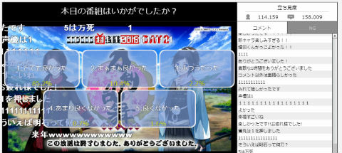 放送終了時で来場者は11万人超、コメント数は16万を超え、タイムシフト予約は5万件弱。アンケートでは85%が番組内容について「とても良かった」と答えています。