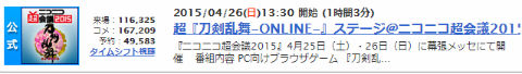 ニコニコ超会議2015で4月26日に開催されたブラウザゲーム 「刀剣乱舞 -ONLINE-」のステージイベント。生配信には11万人の視聴者が集まり、あらためて人気の高さがうかがえました。