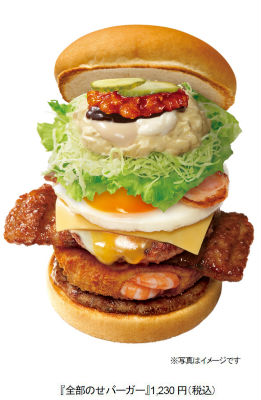 ロッテリアは4月27日、全具材をはさんだ「全部のせバーガー」を期間限定で発売した。税込1230円。