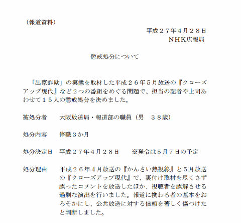 NHKはこの件に関して、担当の記者や上司、合わせて15人の懲戒処分を決定。当該記者は停職3カ月、ほかは減給やけん責処分となる。籾井勝人会長ら役員4人は役員報酬の一部を自主返納する。