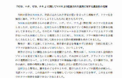 さらに、原作者や講談社が脚本を確認する段取りについて、NHK幹部が裁判の中で「検閲」と表現したことで、「作品は原作者のものであり、作家の意志を尊重せずに作品を一方的に改変したドラマが制作されることはあってはならないという立場に立つ弊社としては、この幹部の発言は到底受け入れがたく、見識を疑わざるを得ません」とコメント。