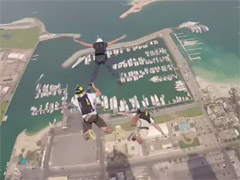 ドバイ2番目の高さを誇る414メートルのビルに立つやたらと軽装なダイバーたち。ビルの先端にちょこんと突きだしたジャンプ台は、普通の人は立つだけでも震え上がってしまいそうな高さです。ところがダイバーたちは歓声をあげながら次々に地面に向かって飛び降りていってもう大興奮。高速宙返りをしながら飛び降りたり、逆立ちをしてからそのままジャンプしたり、数人で手足をつかみあいながら落ちていったりと大はしゃぎです。なんでそんなに楽しそうなんだよ……絶対おかしいよ……。