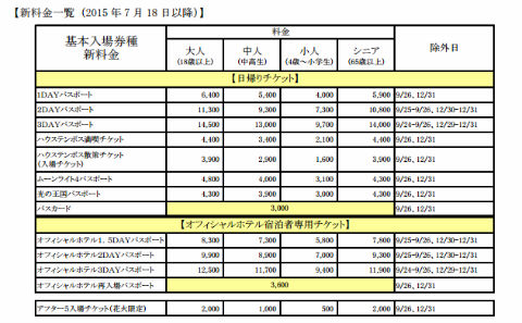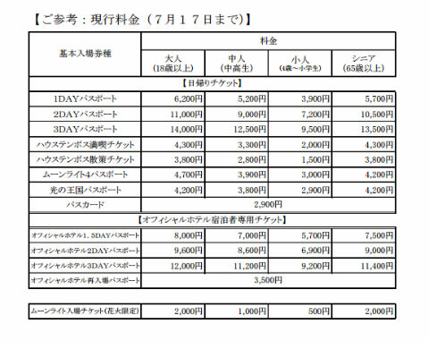 ハウステンボス散策チケット(入場チケット)は3800円から3900円に、2DAYパスポート1万1000円から1万1300円、3DAYパスポートは1万4000円から1万4500円にそれぞれ値上げされる。