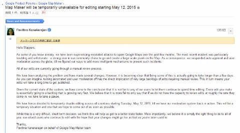 これを受けてGoogleは、イタズラ投稿を防ぐ方法を見つけるまで、ユーザー投稿の自動承認とほかのユーザーによるレビューを一時停止するとしている。自動承認をやめてすべての投稿を手動でレビューしているが、処理が追いつかなくなるため機能の一時停止を決定した。