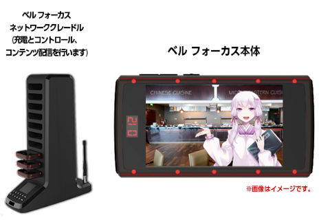 搭載されるのはジオネクサス製の次世代ベル「ベル フォーカス」。手のひらサイズの端末にディスプレイがついており、結月ゆかりの動画と音声で呼び出し。また待ち時間にディスプレイで映像コンテンツを視聴できます。呼び出しのほか、さまざまな音声案内も結月ゆかりが担当。映像コンテンツではボーカロイド作品の紹介などのコラボレーションを予定しているとのこと。