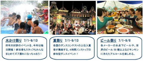 ハウステンボスでは他にも、水鉄砲やバケツで水をかけ合う「水かけ祭り」、参加型ダンスイベント「夏祭り」、「ビール祭り」を合わせた「ハウステンボス夏の3大祭り」が7月1日から開催。また約520インチの巨大スクリーンを使い、最大24人で同時プレイができる釣りゲーム「釣りアドベンチャー」も7月18日から実施されます。光の丘や光のどうぶつえんといった夜限定のイルミネーションも。