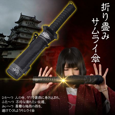 また持ち手部分が刀の柄のデザインとなっている「折り畳みサムライ傘」もサンコーより発売されています(税込2480円)。