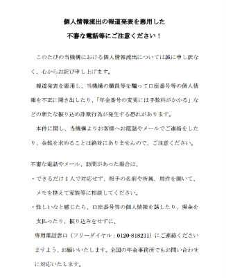 例えば、日本年金機構での個人情報流出が発覚した後に、同機構をかたる不審な電話が発生しています(関連記事)。同機構は「お客様へお電話やメールでご連絡をしたり、金銭を求めることは絶対にありません」として注意を促しています。同機構は情報が流出した加入者に文書を郵送して通知する方針です。