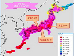 最高気温はきのうよりも高くなる所が多く、名古屋はきのうよりも6度高い32度まで上がる予想。厳しい暑さになるでしょう。大阪も、きのうは暑さがおさまっていましたが、きょうは30度まで上がる予想。体に無理のないよう、暑さを避けて過ごすようにして下さい。