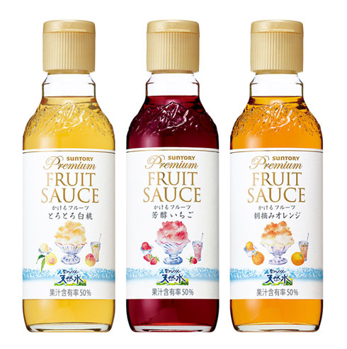 「サントリー 南アルプスの天然水 プレミアムフルーツソース」は、「芳醇いちご」「とろとろ白桃」「朝摘みオレンジ」の3種類で、いずれも300ミリリットルで554円(税別)。果汁含有率50%以上、南アルプスの天然水を使用したシロップです。そのままかき氷にかけてもよし、炭酸水で割ってフルーツソーダにしたり、果肉を足してシャーベットやジャムにして使ったりと、さまざまな楽しみ方ができるそう。詳しいレシピは特設ページで公開されています。