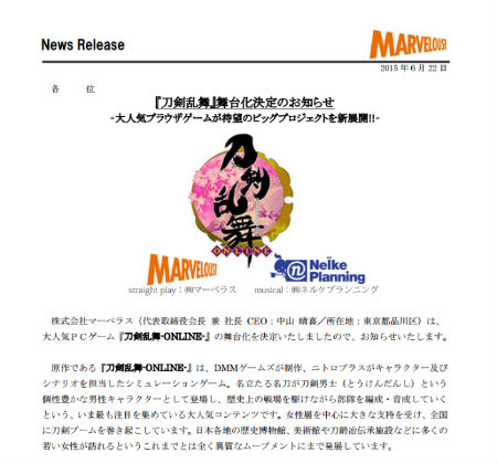 マーベラス、ネルケプランニングはこれまでにも、ミュージカル「テニスの王子様」など「2.5次元」舞台(漫画やアニメ、ゲームなどを原作・原案にした舞台)を手掛けている。