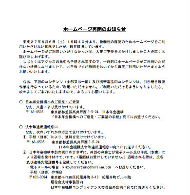 同機構は脆弱性が発見されたとして、6日午後3時40分からWebサイトへのアクセスを停止していた。Webサイトは再開したが、意見や要望の送付、法令違反通報窓口など一部のコンテンツ、携帯電話用コンテンツはまだ確認作業を行っており、利用できない状態。利用できるようになったらあらためて告知するとしている。