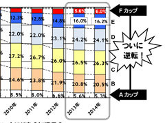 A・Bカップと、D・Eカップの割合を、2000年度と2014年度で比べてみると、カップサイズがいかに大きくなったかがわかります。A・Bカップは、2000年度の45.6%から2014年度の25.8%にほぼ半減。一方、D・Eカップは 2000年度の24.6%から2014年度には40.3%と約1.6倍に増加しています。