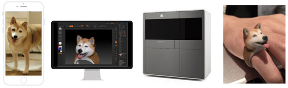 ペットの写真を撮ってメールで送り、3Dデータを確認すると、3Dプリンタでリングを作ってくれます