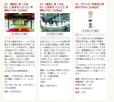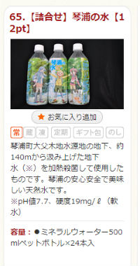 ふるさと納税の特典となっているのは、琴浦さん等身大パネル。アニメイラスト版琴浦春香の、高さ約150センチ×幅約50センチの看板です。ゲットするには10万円以上の寄付が必要。ハードルが高い……という人には、1万2000円以上の寄付でもらえる琴浦さんラベルの「琴浦の水」24本セットもあります。