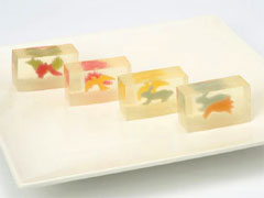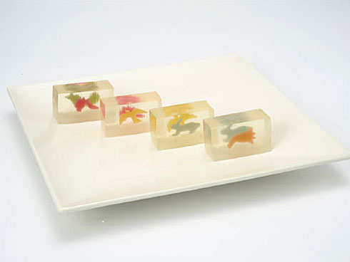 アートディレクターの渡邉良重氏がデザインした羊羹。百合、うさぎ、鳥、女の子、りす……と、切り分けるたびにさまざまな意匠が登場します。食べる人が思い思いに物語を想像し、楽しめる羊羹です。
