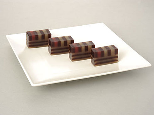 テキスタイルデザイナー、須藤玲子氏がデザインした羊羹が「SHIMAMOYO」。太い縦縞と細い横縞を組み合わせ、3色の縞模様を重ねた羊羹です。切り分けたり、並べたりすることで、布地を広げたように新たなデザインが生まれます、とのこと。