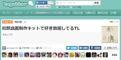 以前ご紹介した鳥獣戯画を自作できる「鳥獣戯画制作キット」(関連記事)が、Twitterで盛り上がりを見せています。例によって、クールジャパンな作品が量産されていました。