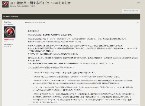 同タイトルは、実在する艦船が多数登場することが特徴。ゲーム内に旭日旗が登場していることについて、フォーラムでさまざまな議論や対応があったという。これによりオープンβテストの開始に伴い、「さらなる誤解やプレイヤー間の対立や議論、対応の差異などを避けるため」旭日旗の使用についてガイドラインを制定したとしている。