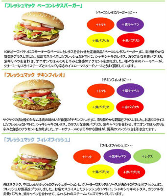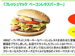 「フレッシュマック ベーコンレタスバーガー」(単品390円)、「フレッシュマック チキンフィレオ」(単品390円)、「フレッシュマック フィレオフィッシュ」(単品360円の3種を発売。朝マック時間帯にも「フレッシュマフィン」(単品290円)を投入している(価格はいずれも税込)。野菜はトマト、レタス、赤黄パプリカ、紫キャベツなどを使用。