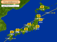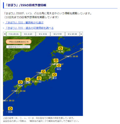 日本気象協会の予想では、今夜は北海道は雨、東北と関東甲信は雲が多く、北陸、東海から九州、沖縄はおおむね晴れ。さらに今日は7月で2回目の満月(関連記事)。ISSもお月様も眺めたいですね。