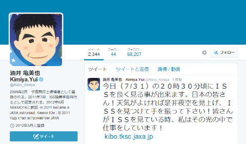 今日(7月31日)は国際宇宙ステーション(ISS)が見える! 現在ISSに滞在している油井亀美也宇宙飛行士がツイートしています。