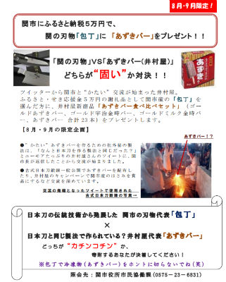 井村屋と関市の市長は、日本刀鍛錬画像を「伝統的なあずきバーの製法」としてネタにしたツイートをきっかけにTwitterで交流。以前には、同市の古式日本刀鍛錬実演であずきバーを配布したこともあります(関連記事)。ふるさと納税でのコラボもその流れで生まれたもの。関市も「(包丁とあずきバー)どっちが“カチンコチン”が寄附するあなたが決着してください!」とノリノリ。