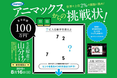 アニメ専門チャンネル・アニマックスが世界で上位2%の頭脳集団MENSAとタッグを組み、日本のアニメファンを相手に挑戦状を叩きつけて参りました! 賞金総額は100万円です。