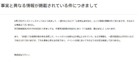 モンストフェスティバルで「心肺停止者が出た」といううわさや、「飲み物の持ち込み禁止」という「とくダネ!」の報道を否定した。