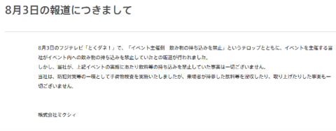 また同イベントでは「飲み物の持ち込みを禁止した」との情報も出回っており、フジテレビ「とくダネ!」(3日放送)でもこのような報道を行った。ミクシィはこれも否定し、持ち込み禁止ではなく、防犯対策で手荷物検査を実施したが、飲み物を没収したり、取り上げたりした事実は一切ないと述べている。