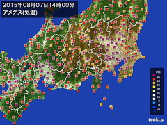 14時までで最も気温が上がっているのは、群馬県館林 38度7分。次いで、千葉市 38度5分。千葉市では、1966年の統計開始以来、最も厳しい暑さになりました(今まで最も暑かったのは2013年8月11日の38度4分)。