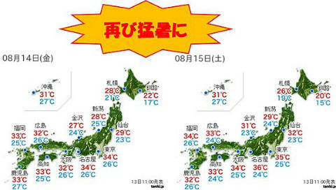 土曜日はさらに気温の上がる所が多く、東京や名古屋でも再び35度以上の猛暑日になる見込みです。熱中症には十分に注意しましょう。