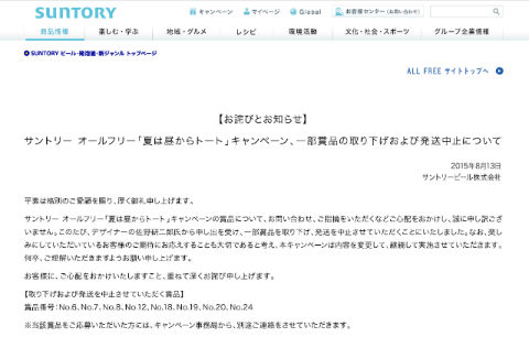 サントリーは8月13日、佐野研二郎さんがデザインしたプレゼントキャンペーンの賞品を一部取り下げて発送を中止することを明らかにした