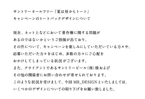 盗用疑惑指摘された佐野研二郎さんデザインのトートバッグ、サントリーがキャンペーン賞品から取り下げ