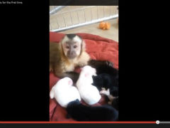 まだ幼過ぎてもぞもぞとしか動けない子犬たちですが、次第にみんなお猿さんの方へ集まってきました。子犬たちを見つめるお猿さんの目がとても優しいので、お母さんのように思えてきますね。
