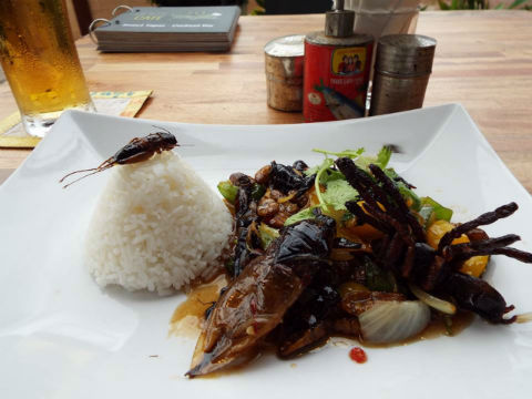 運ばれてきた料理は、野菜と一緒にたくさんの虫たちが炒められています。