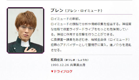 敵の幹部ながら個性あふれるキャラで愛されていたブレンさん(「仮面ライダードライブ」キャストページより