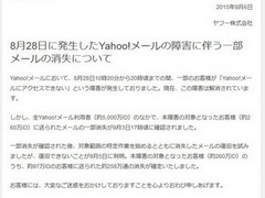 8月28日10時20分から20時ころまでの間、一部のユーザーが「Yahoo!メールにアクセスできない」という障害が発生(障害は現在解消されている)。この障害に伴い、全Yahoo!メール利用者(約5000万ID)中、障害の対象となった約260万IDに送られたメールの一部が消失したことが9月3日17時ころに確認されたとのこと。