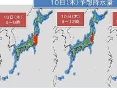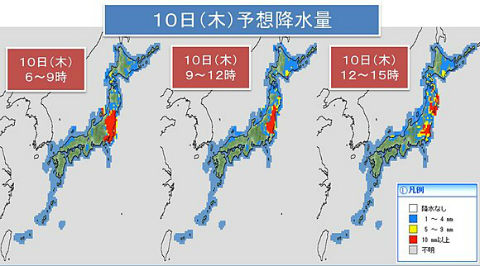 関東甲信から東北地方では、10日木曜も広い範囲で雨が降り、局地的にカミナリを伴って激しい雨が降るでしょう。傘をさしても濡れるような雨で、道路が川のようになることもあります。関東南部は午前中を中心に、関東北部や東北は午後も、雨の降り方に注意してください。