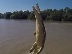 オーストラリアのアデレード川で撮影されたこちらの映像。空中に餌を吊るしていると、水中に潜んでいたワニが垂直ジャンプ! 全身が水面に出るようなすさまじい跳躍力に驚かされます。