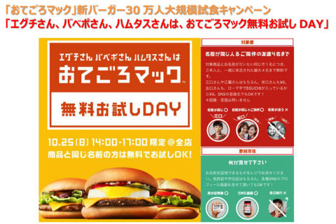 渋谷店、渋谷センター街店、渋谷東映プラザ店の3店舗では10月16日から先行発売する。10月25日14〜17時の3時間限定で、これら商品のニックネーム「エグチ(エッグチーズバーガー)」「バベポ(バーベキューポークバーガー)」「ハムタス(ハムレタスバーガー)」と同じ名前の人とその同伴者に3商品のいずれかを無料で提供するキャンペーンも実施する。
