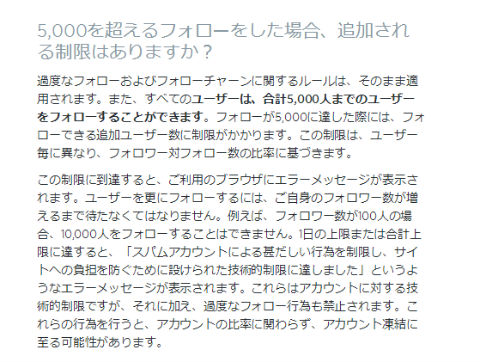 ただし5000件以上フォローできないわけでなく、5000件に達したあとは、フォロワー数とフォロー数の比率によってフォローできる追加アカウント数が決まります。